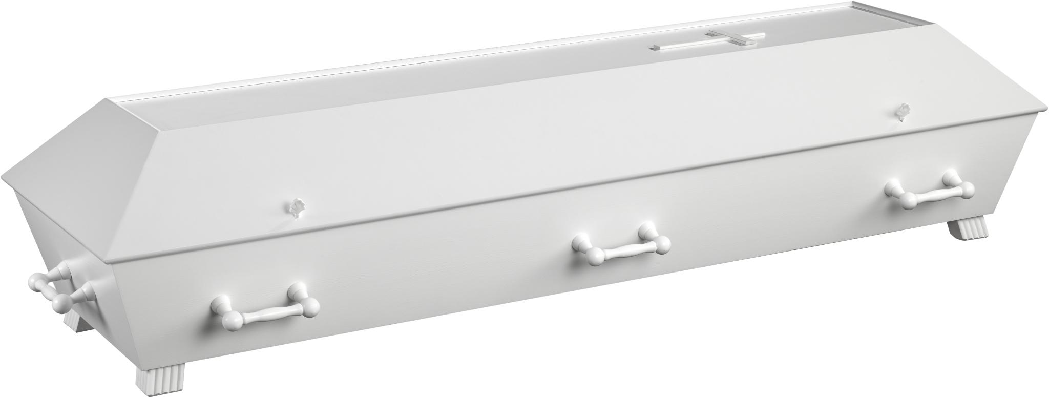 Hvitlakkert kistemodell uten profiler. Modellen leveres med dreide trehåndtak.